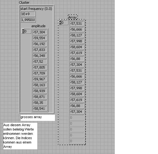 Die Leistungspegel werden vom Spektrumanalysator in einem Cluster ausgegeben. Ich kann auf die Werte aus dem Cluster nur zugreifen, wenn ich die Werte mit der for - Schleife in das Array schreibe.
