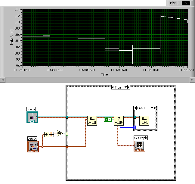 Ich habe es so gelöst wie im letzten Bild, mit einem Time Chart. Ich habe das gleiche Resultat mit einem XY-Graph bekommen. So habe ich mich doch für Time Chart entschieden, weil man da keine Gedanken um die dynamische Abspeicherung des Arrays machen muss und, das wichtigste, keine Gedanken um die Skalierung und die Position der Scroll-Leiste. Also die Russen hatten Recht. Das Problem lag an der Aufrundung (Genauer gesagt Überlauf) des Zeitstempels. So hatte ich ab und zu keine eindeutige Zuordnung X<->Y. Deshalb eine fehlerhafte, unschöne Darstellung.