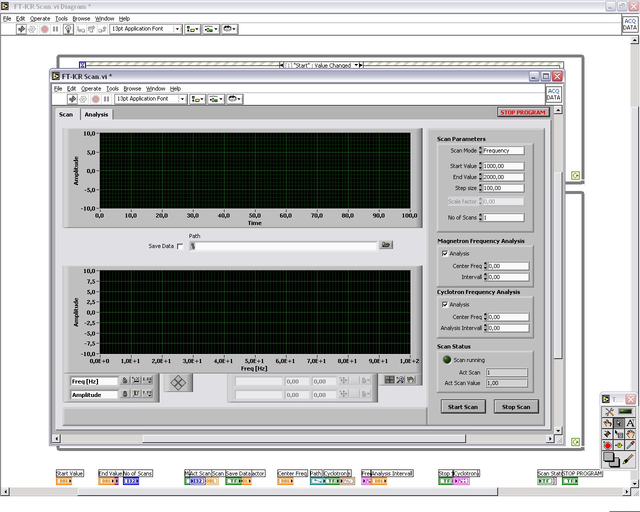 Ich habe nun ein , naja zwar funktionierendes aber sehr benutzerunfreundliches, Programm zur Resonanzmessung fertiggestellt. Persönlich bin ich mehr als unzufrieden, auch wenn es seinen derzeitigen Zweck erfüllt. Als Beispiel hab ich mal das Frontpanel unten mit angehangen. Daraus geht vielleicht dem einen oder anderen die Idee meines kleinen Messprogrammes hervor.