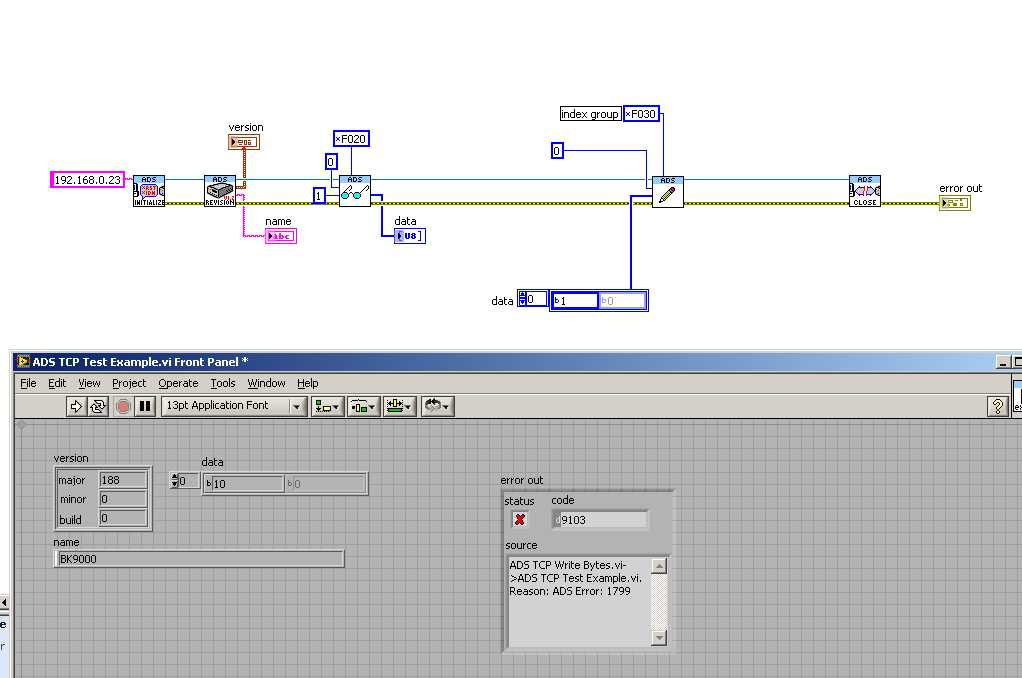 Geöffnet hab ich gerade das file "ADS TCP Test Example.vi" in das ich die IP von meinem BK9000 eingetragen habe.