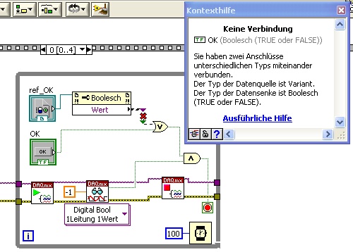 ich möchte gerne über den OK - Button im aufrufenden VI über die Referenz (Bild) die While-Schleife stoppen. Das Schaltverhalten des Buttons ist "Schalten beim Loslassen" war jedoch zuvor eine Latch Funktion. Als ich jedoch bemerkte das es zu dieser "Wettlaufsituation" kommt, habe ich das Schaltverhalten nachträglich verändert. Mich würde nun interessieren warum ich diesen boolschen Wert nicht abfragen kann?? (unterschiedliche Typen) Und des weiteren,.. kann es sein das LabView die nachträgliche Änderung des Schaltverhaltens nicht registriert?