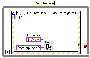 Der Aufruf dieser Dialogmasken geschieht in einer eigens dafür angelegten While-Schleife (im Blockdiagramm des MainVI) in welcher sich eine Ereignisstruktur befindet. Unterscheidung ist dann mit Mausklicks auf die verschiedenen Ojekte gegeben.
