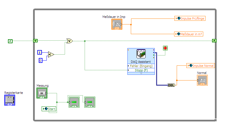 ich überblicke nicht ganz was du machen willst. Aber für meines Erachtens benutzt du eindeutig zu viele globale Variablen. Als Beispiel in der Prüflingsschleife: Du schreibst und liest innerhalb eines Schleifendurchlaufes die Variable "Impulse Zähler 1". Wie schauen dabei die Abhängigkeiten aus? Ich bin jetzt nicht der Experte in den globalen Variablen von LabVIEW (ich baue mir meine selbst), aber unter bestimmten Umständen kann es eventuell vorkommen das erst aus der Variablen gelesen und anschließend geschrieben wird. Aber es kann auch anders herum sein, also aus meiner Sicht völlig unbestimmt. Darum meine Frage welche Abhängigkeiten zwischen dem oberen und unteren Teil der Prüflingsschleife bestehen.