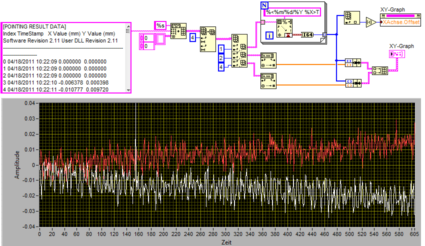 Sie sind im VI eingetragen. Mit einem X-Achsen-Offset der Temperaturmesswerte habe ich erreicht, dass diese schon einmal Zeitlich synchron unterhalb der Pointing-Daten dargestellt werden.