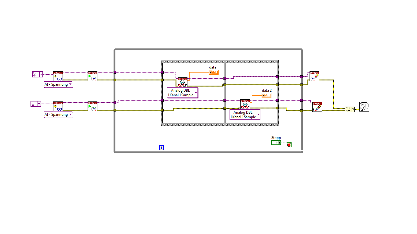 Zum einen kann der cDAQ nur 4 Analoge Tasks gleichzeitig, weswegen ich 2 immer wieder abwechselnd starten und beenden muss in der while schleife, zudem nutze ich (wie in diesem Threat beschrieben) einen Kraftsensor, der mir einige Probleme bei den Samples bereitet, ich hab schon überlegt, ob ich den Kraftsensor nicht in einer eigenen while Schleife setze die parallel zur anderen läuft bei dem der Rest gemessen wird, jedoch ist dies auch kaum möglich.