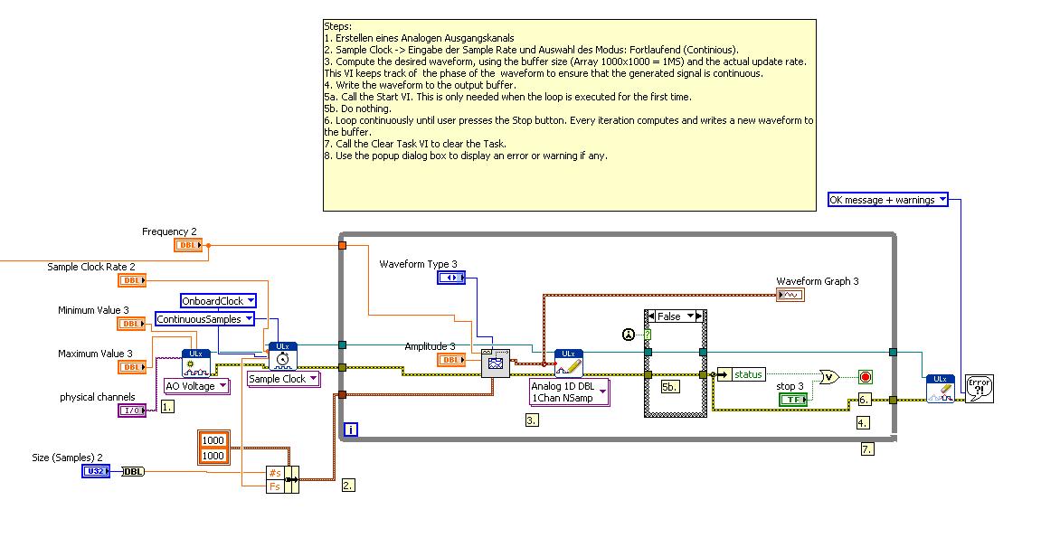 -Oben links: for-Schleife Erfassung 10x eine Periode = 10 Schwingungen (2 Sinussignale)