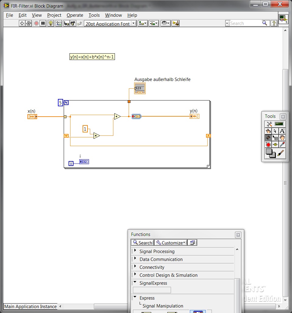 Ich hab nun die von dir angesprochenen FIR-Filter ausprobiert, ist eigentlich eine feine Sache, ich komme aber mit den Koeffizienten nicht zurecht. Ich bräuchte ja nur einen Koeffizienten für b=1. Du hast aber drei Zahlen mit 110 eingestellt. Wie ist das zu verstehen? In der Hilfe lese ich raus, dass das wiederum als Array anzusehen ist? Ich komme dabei aber nicht auf mein Ergebnis für y(n) = 0110, bei einer Eingabe von x(n) = 0100.