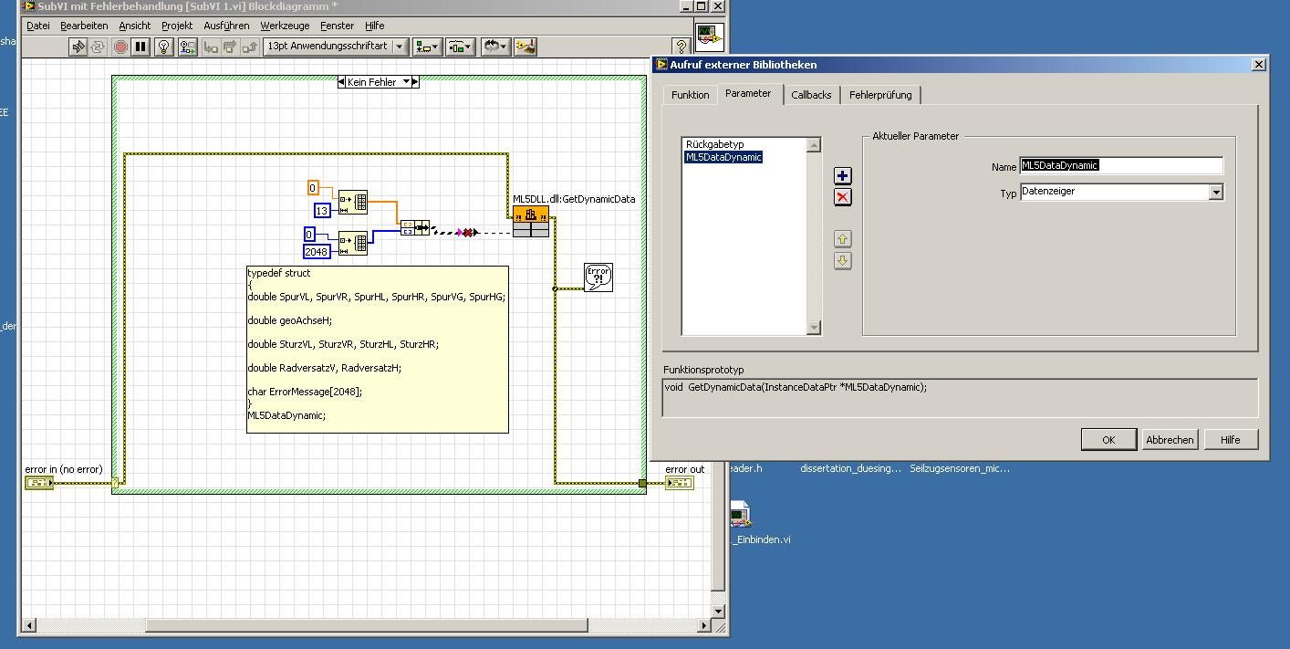 Diese DLL soll ich in mein LV-Programm einbinden. Nachdem ich die Foren durchgesucht habe, weiß ich nun, dass es in LabVIEW über den "Knoten zum Aufruf externer Bibliotheken" machen kan.