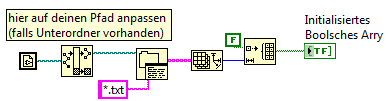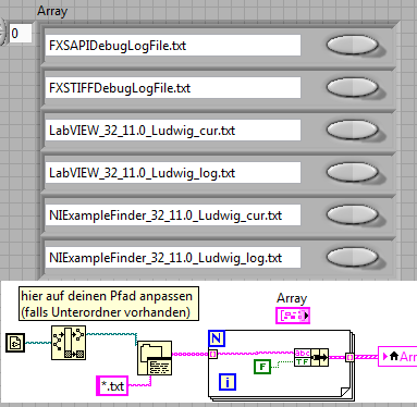 So wie ich es verstanden habe möcht er gerne die Anzahl haben als Control damit er eines dafür drücken kann und dann öffnet sich die txt oder wie auch immer, in deinem Programm wird ein Indicator-Array auf eine Anzahl die gleich der Anzahl von txt's in einem Ordner ist gesetzt. Das ist ja eigentlich nicht die Antwort auf seine Frage. Mein Weg war etwas kompliziertes als deiner weil ich dieses suchen nach Daten mit der Endung nicht kenne / nicht habe. und weil ich nicht wusste ob er nun das Array in Spalten oder Zeilen haben möchte habe ich geschrieben er muss sich das aussuchen was er beim Eigenschaftsknoten zu welcher Anzahl setzt. Also mit dem Teil von dir bis zu der Anzahl und dann einem Eigenschaftsknoten wo die Spalten vom Control-Array gesetzt werden sollte es dann ja funktionieren.