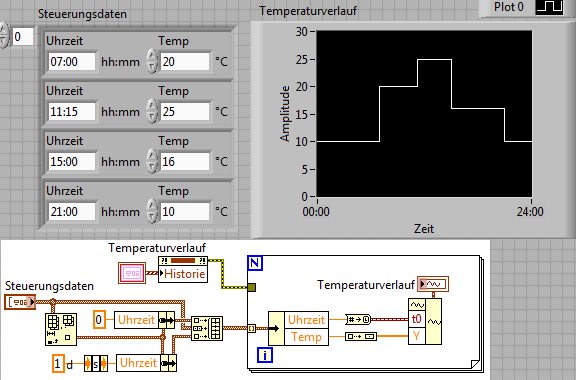 Mein Problem ist das folgende: Ich will mit einer .vi zur Steuerung eines Thermostaten einen Temperaturverlauf fahren. Ich habe mir schon überlegt, eine .txt einlesen zu lassen, in der zeilenweise [bis Zeit] und [Temp.] drinstehen. Dann halt "gucke in die erste Zeile, stelle die Temp ein, vergleiche die Zeit. Gehe irgendwann zur nächsten Zeile".