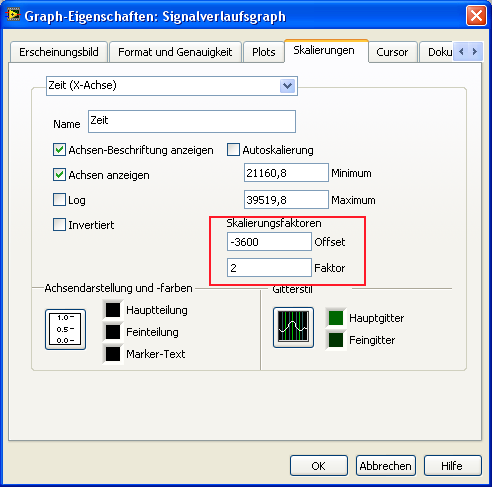 Der Eigenschaftsknoten ist etwas schwer zu finden: X-Achse / Offet und Faktor
