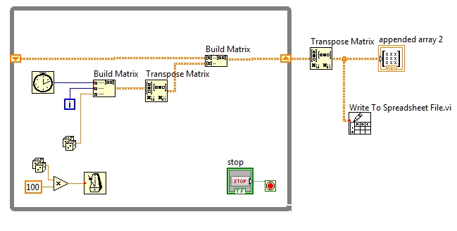 Jetzt würde ich gerne alle diese Werte mit dem jeweiligen Zeitpunkt an dem der jeweilige Wert ermittelt wurde in eine Datei speichern. Speichern kann ich die Werte mit dem "Write to Spreadsheed-File.vi" welches bei jedem Durchlauf den Wert in eine Datei schreibt, bzw. den anderen Werten in der Datei anhängt.
