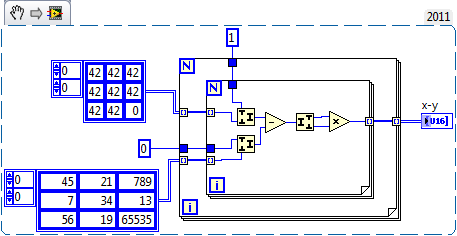 Einzelne Werte abfragen, ob sie negativ sind, funktioniert nicht - das Ergebnis einer Operation mit Ausgangswert U16 ist definitiosgemäß immer positiv. Wegen der Performance möchtest du nicht jeden einzelnen Wert vergleichen. Das musst du auch nicht - viele LV-Operationen sind polymorph und kommen auch mit 2D-Array zurecht. Mit der Vorarbeit von unicorn sähe das dann so aus (Wobei ich mir jetzt nicht sicher bin, ob es noch etwas einfacher geht):