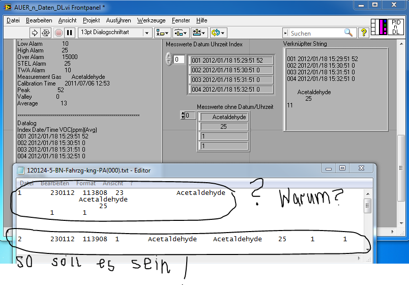Die Daten sind in txt-Datei nach dem Abspeichern durcheinander (s. Abb: Frontpanel und Blockdiagramm). Habe ich was falsch gemacht? Ein Element des ersten Arrays und anderes Element des zweiten Arrays sollen in eine Zeile geschrieben werden! Aber wie??? Ich habe schon vieles ausprobiert, aber erfolglos(((
