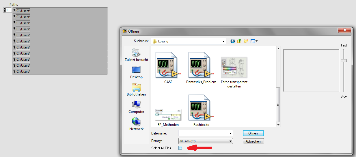 Natürlich kannst du jetzt auch für jedes deiner Bilder die selbe ROI verwenden. Wichtig dabei ist, dass alle deine Bilder die selbe Größe haben. Dann kannst du den Teil in dem "ausschneiden.vi" der in der Case-Struktur drin ist einfach durch eine For-Schleife ersetzen. Damit du alle Bilder auf einmal lädst, kannst du zum Beispiel den Dateidialog der IMAQ-Palette verwenden und dort auf Multidatei umstellen. Dann bekommst du alle Bilder, die in einem Ordner liegen und kannst somit all diese Bilder nacheinander bearbeiten. Dann musst du nur noch in der For-Schleife das speichern der Bilder machen. Hierfür würde sich es einfach eignen den "Originalpfad" zu nehmen und dort ein Wort (z.B. Rechteck) anzuhängen.