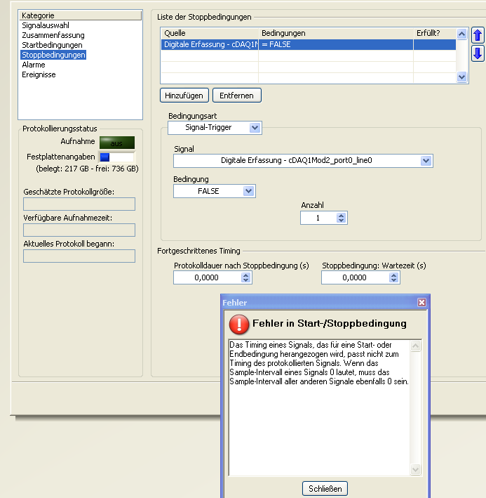 Wähle ich bei Bedingungsstart / Ende den Softwaretrigger läuft das wie gewünscht. Es muss doch möhlich sein die Aufzeichnung anhand von Eingangssignalen zu starten bzw. zu stopen.