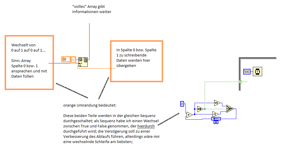 Im Anhang lade ich meinen bisherigen Entwurf hoch, er ist umständlich, da mir nicht klar ist, was genau der Teil von NI tut. In der Hoffnung einen regelmäßigen Wechsel jede 0,5 Sekunden zu haben und entsprechend die Daten listen zu können, habe ich eine Struktur aufgebaut die leider nicht funktioniert.