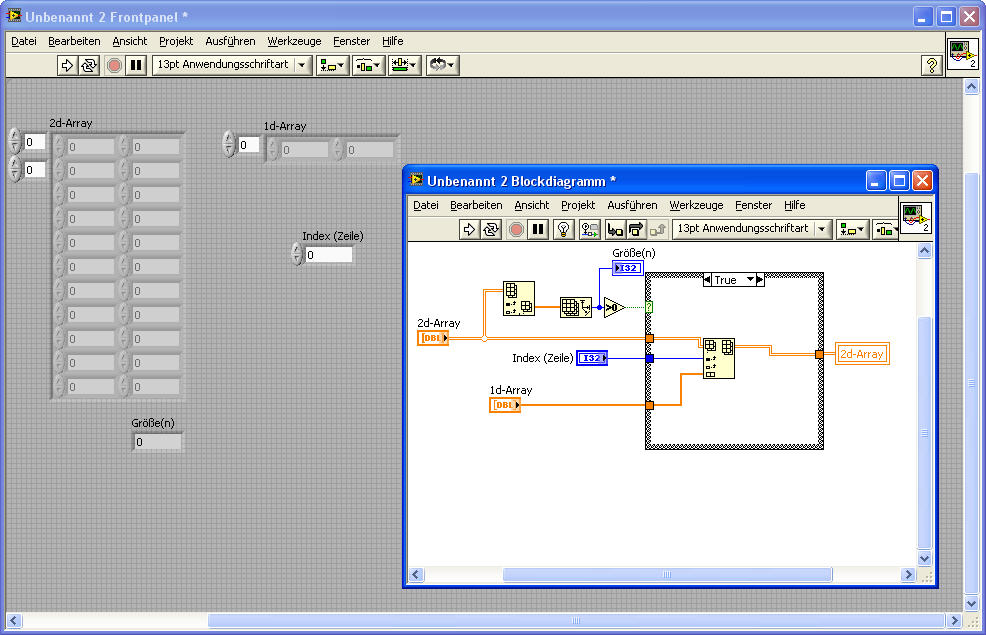 INSERT INTO ARRAY, dafür muss Dein Array aber schon mindestens einen Eintrag haben. also ein 2D-Array an "Insert into Array" anschliessen, Index (Zeile) anschliessen (für Deine Position im Array) und dann ein 1D-Array mit Deinen zwei Werten an "neues Element". Wenn Dein Array am Anfang noch leer ist, machst Du ein Array erstellen (Build Array). Also am besten Dein Array mit "Arraygröße" kontrollieren, dann nen True/False-Case dahinter, wenn Array schon belegt (Arraygröße > Null) ist Dein Case TRUE und Du nimmst "Insert into Array", wenn False (Arraygröße = Null) nimmst "build Array". An den Ausgang schließst Du ne lokale Variable von Deinem Array an.