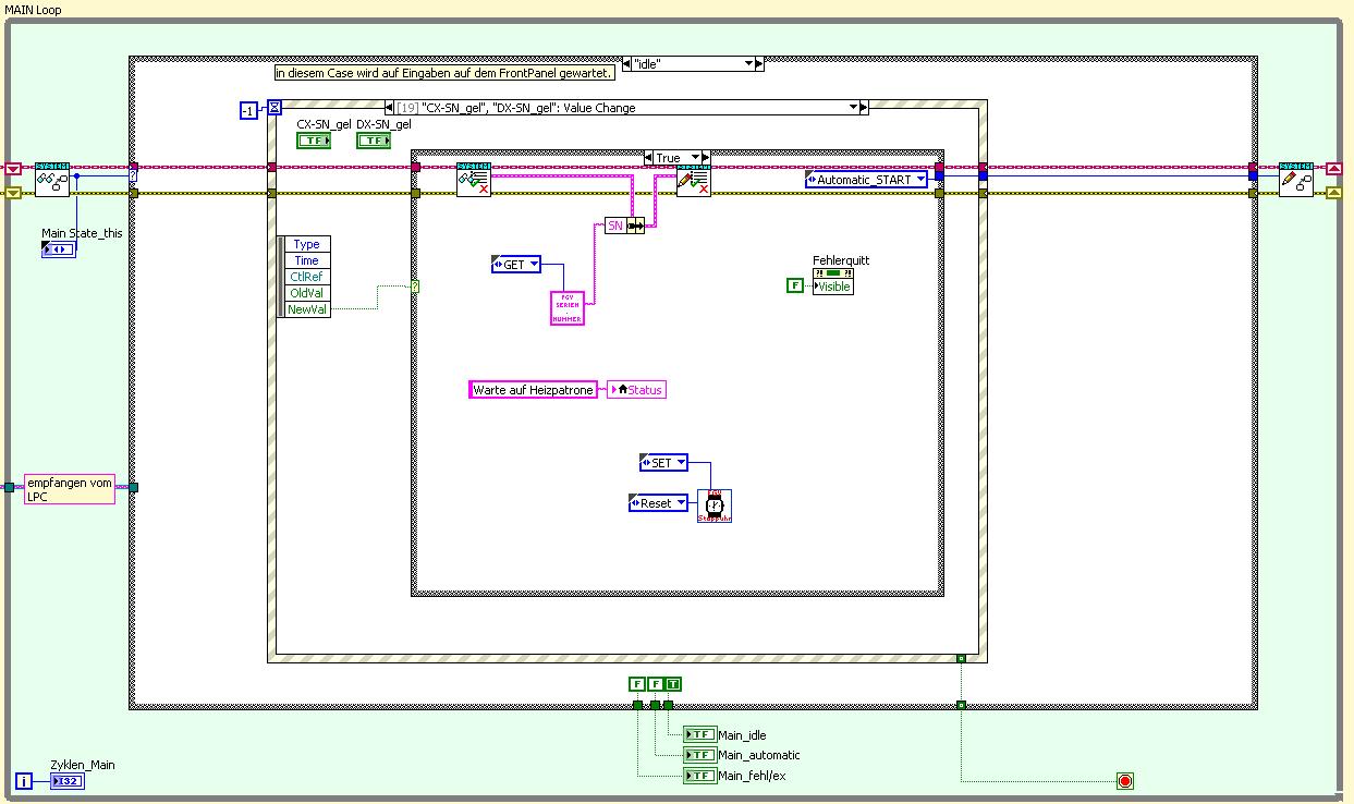 nene...Die HP (HeizPatrone) lege ich in dem Fall selbst in den Prüfautomaten. Dieser fängt darauf hin auch wie gewollt automatisch an zu prüfen. Die Main-State-Machine verlässt also den "Idle"-Case mit der Event-Structure und geht über den Case "Automatic-Start" in den Case "Automatic-Run". Nur das FP bleibt blockiert.