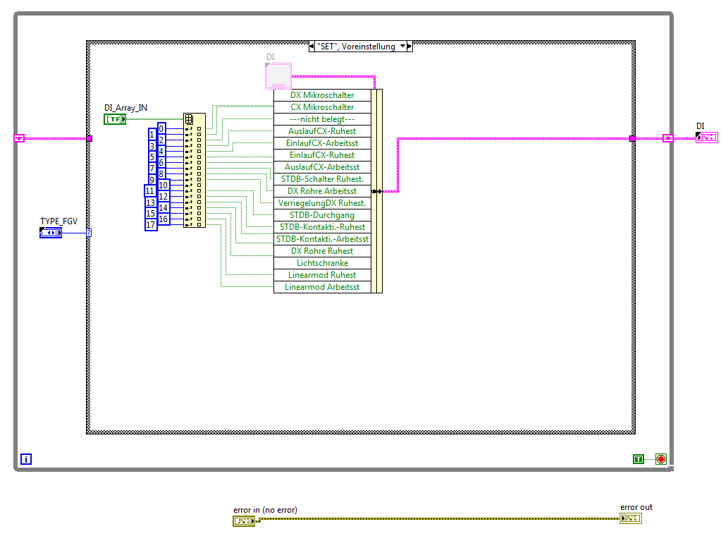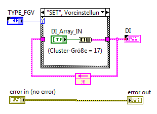 Zu deinem 2. Hinweis: Hatte ich früher so gemacht wie du es vorgeschlagen hast. In diesem Fall musste ich jedoch "trocken" Programmieren, also Programm so weit wie irgend möglich fertig stellen, ohne ausprobieren zu können. Und ich musste mich auf die Eingangsbelegung verlassen, die ich auf einem Stück Papier mitgeteilt bekommen habe. Wenn ich jetzt einfach mithilfe der Funktion "Array to Cluster" Array[0] auf Cluster1 (usw) setze und damit Programmiere, und sich hinterher heraus stellt, dass Array[0] eigentlich zu dem Eingang gehört, den ich auf Cluster4 gelegt habe, hätte ich überall, wo das Cluster aufgerufen wird, die entsprechende Abfrage ändern müssen. So kann ich einfach in der FGV das Wire von Array[0] zu Cluster1 umverdrahten auf Array[0] zu Cluster4.