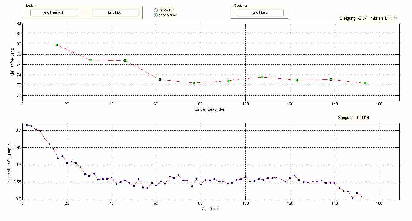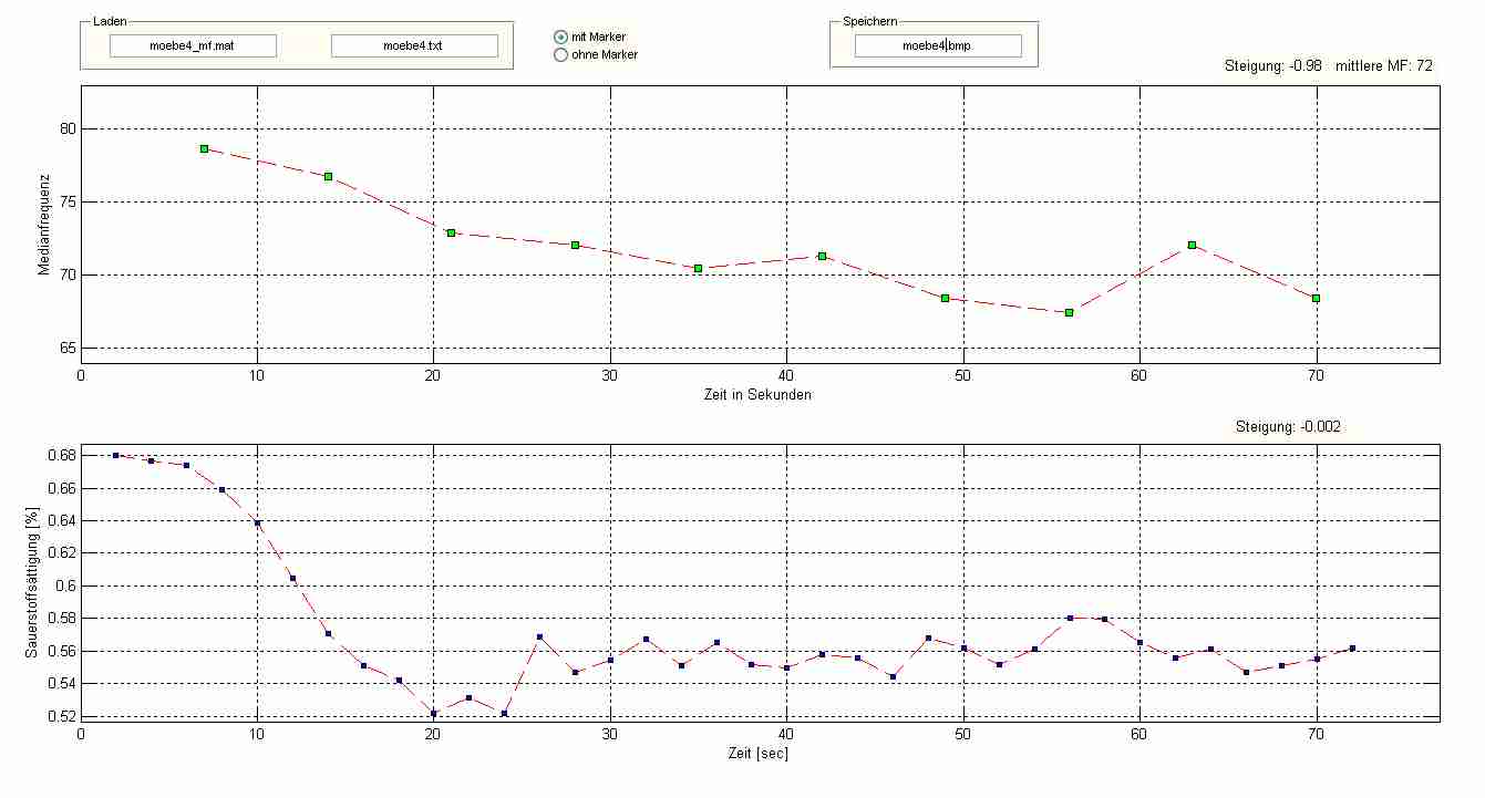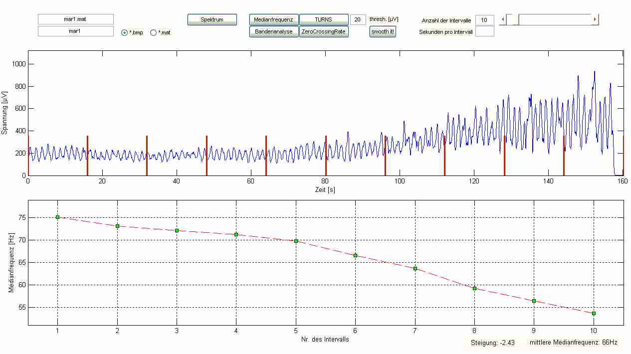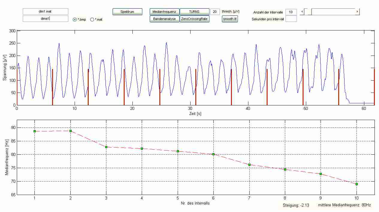 Das war meine beste Aufnahme. Nicht nur, dass die Mittenfrequenz stetig sinkt, auch die Amplitude des RMS-Signals steigt. In der Literatur wird das damit begründet, dass das zentrale Nervensystem immer mehr motorische Einheiten rekrutiert. Das hab ich nur einmal so hinbekommen.