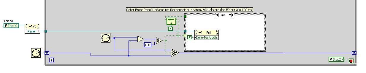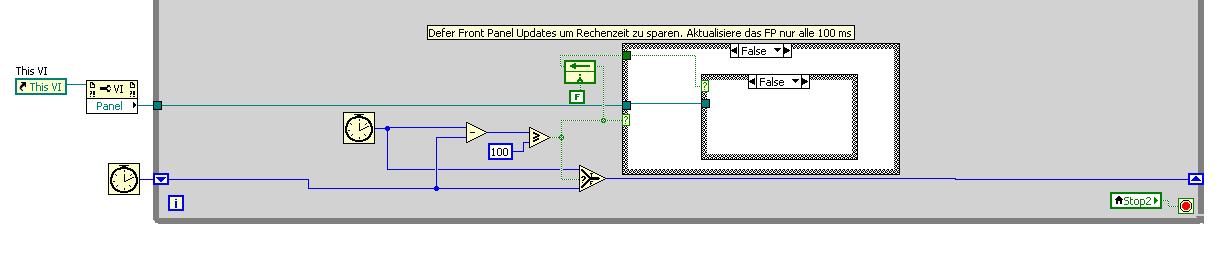 Ja, überlegt habe ich das auch schon. Aber die einzige Idee, die hatte, wie mich diese PropertyNode weiter bringt, war, für jedes Anzeigeleement eine PropertyNode zu erstellen und nur alle 100 ms einmal eine aktualisierung zuzulassen...das kam mir aufwändig vor. Hmm...wo ich das gerade nieder schreibe...ließe sich das mit VI Server automatisieren? Damit habe ich bisher so gut wie keine Erfahrung. Muss ich mir noch mal angucken :-)