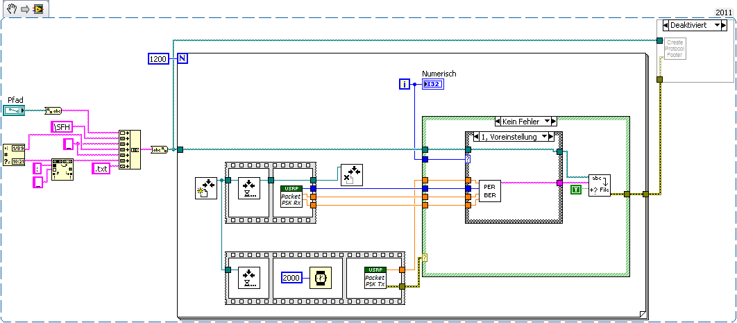 Mein Main.vi bringt meine beiden SubVis, dass der eine was sendet, der andere was empfängt. Nachdem alle Pakete gesendet worden sind, werden Messungen durchgeführt und diese in eine Datei geschrieben. Dieser Vorgang wird in dem Fall 1200 mal wiederholt.