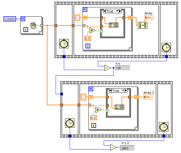 Aber: Es ist ein geradezu gigantischer Zeitunterschied, ob bei Build Array ein neues Element am Anfang oder am Ende des Array hinzugfügt wird. Geschieht es am Anfang, dann werden bei jedem Hinzufügen alle alten Arrayelemente umgeschichtet, das kostet enorm Zeit - und genau hier liegt bei Dir der Hase im Pfeffer. Das Hinzufügen am Ende kostet kaum Zeit, wenn man mal davon absieht, dass vielleicht bei jedem 10000stem Element mal wieder etwas neuer Speicher herbeigeschafft werden muss.
