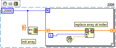 Eine Sache habe ich aber noch, weil ich einen Denkfehler habe oder die Logik der G-Sprache noch nicht verstanden habe: Ich wollte das mit dem "Array-erstelllen" für 120.000 Durchläufe ändern in "Teilarray ersetzen". Vorab ein Array initialisieren mit der Dimensions-Größe entsprechend der Durchläufe der Schleife. in der Schleife dann selber nur noch an entsprechender Stelle im Array rumfuschen. Ich würde mir gerne aber einen Counter erstellen wollen (so bin ich das gewohnt bei anderen Programmiersprachen), um dann hintereinanderweg die Daten ins Array zu schreiben.