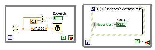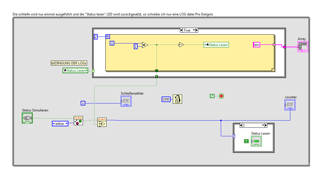im Beispiel Vi muss ich nur den boolischen (true) erzeugen, sozusagen Bedingung, den Rest habe ich schon mit eine Casesturktur gemacht nun fehlt mir die Bedingung für das automatisches Log Erzeugen. Ereignisstruktur wollte ich nehmen damit es nur ein mal ausgeführt wird. Da die die Statusanzeige daurnhahft ein oder aus ist, ist es nicht möglich das ganze mit Case auszuführen. Den boolischen Signal brauche ich nur ein mal und nur bei einem Ereignis.