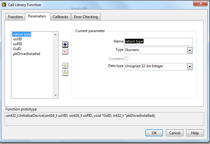 Sind die Datentypen für Handler und die Übergabe der Parameter im richtigen Format für LabVIEW? Oder muss ich Vielleicht sogar komplett anders vorgehen um die richtige Funktionalität zu erhalten.