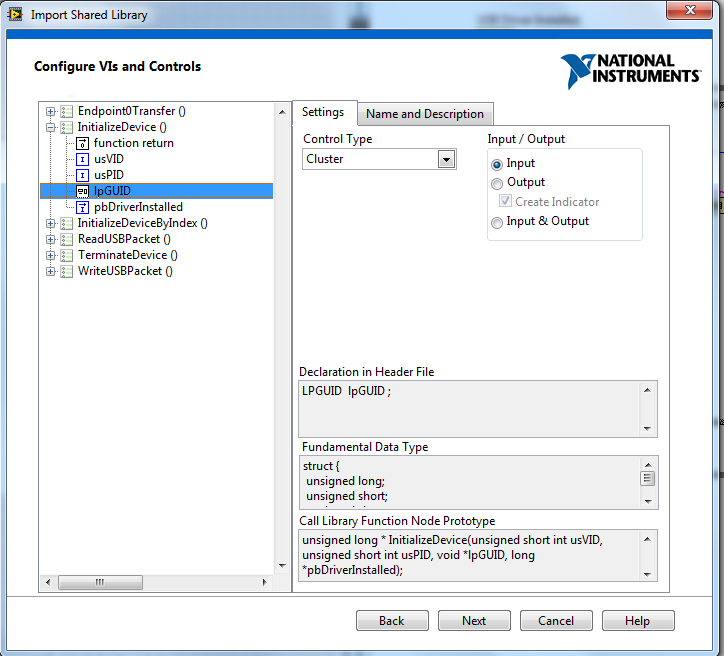 ein Cluster angezeigt. Allerdings ist das Cluster nicht im vi vorhanden wenn ich nach der Erstellung das Blockdiagramm ansehe. Die Datentypen des Structs sind vom Wizzard lediglich einzeln an den Call Function Node Block angeschlossen worden? MIt diesen Konfigurationen erhielt ich einen Fehler von LV(#1097). Ich habe das vom Wizzard erstellte VI dann so editiert, dass die lpGUID als einzelner Parameter also in Form eines Clusters angeschlossen werden kann. Die vom Wizzard erstellten Datentypen habe ich beibehalten.