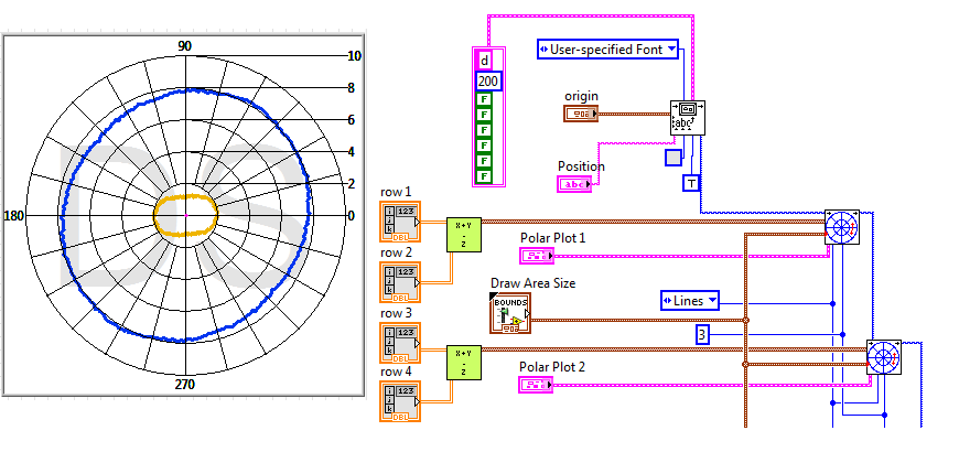 Ich hoffe Ihr könnt mir weiterhelfen. Folgendes Problem: Ich lese einen Datensatz in den Polarplot ein, gebe das Bild aus, lese es in den nächsten Polarplot ein und lese einen zweiten Datensatz der gleichen Versuchsreiche ein. Bild im Anhang. Die Scalierung des Polarplots sollte manuell im Frontpanel gestaltbar sein und für alle Datensätze gleich sein. Ich habe es mit locale Variablen, mit Eigenschaftsknoten und mit Typdefs. probiert. Kann ein Typdef. für den Polarplot verändert werden??? Wenn ja wie??? Ich hoffe meine Fragestellung ist nicht zu wirr. Vielen Dank