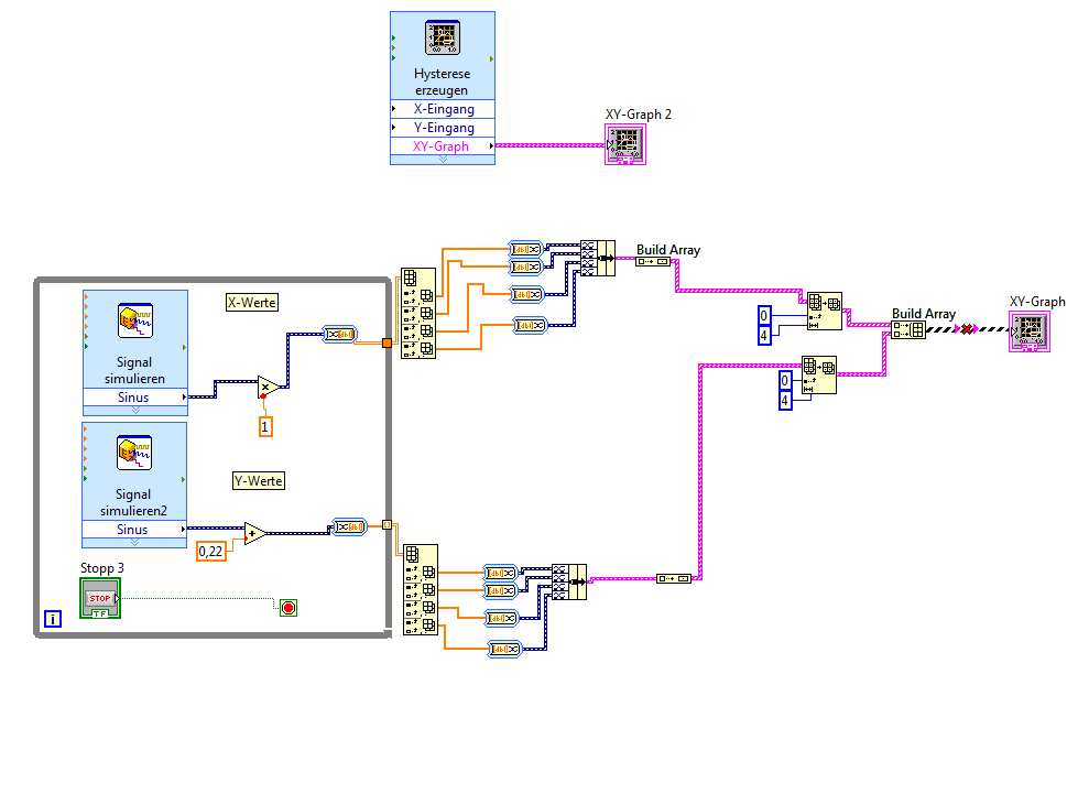 In der ersten Schleifenkombination werden Temperaturen miteinander abgeglichen und die Schleife wird erst verlassen, wenn eine bestimmte Temperatur erreicht ist. Parallel dazu, soll aber noch ein XY Graph aufgezeichnet werden, indem die Temperatur und ein anderer Wert (Y-Wert) aufgeziechnet werden soll.