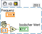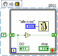 Mit diesem VI möchte ich einen Digitalausgang alle n Millisekunden umschalten. Nur passt da bei der Frequenzerstellung etwas nicht. Es passiert zB gar nichts, wenn man als Frequenz die Zahl 10 oder ein vielfaches von 10 eingibt.