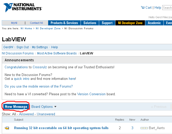 http://forums.ni.com/ Hier wollte ich einen Beitrag posten, ich hab mir ein Acc. eingerichtet, aktiviert und kann auch auf Beiträge Antworten. ABER wo ist der "Thema erstellen" Button? oO ?