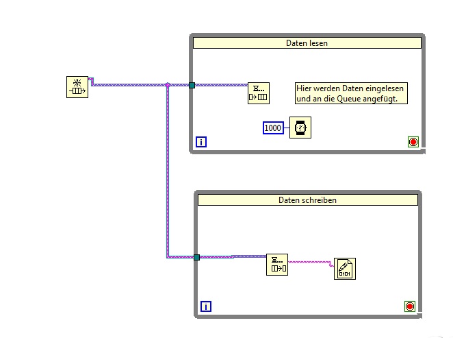 "... deine Queue-Ausleseschleife wartet solange, bis ein Element in der Queue steht, oder ihr Tineout abgelaufen ist. Den würde ich in den meisten Fällen setzen, da sich dein VI sonst aufhängen könnte. ..."