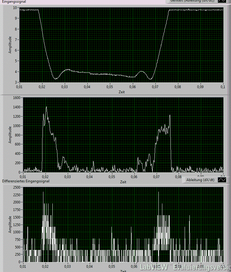 Habe jetzt einmal ein Signal aufgenommen, differenziert und den Betrag daraus gebildet! musste das Signal mit einen Tiefpass filtern, da es ansonsten nicht zu verwenden ist!