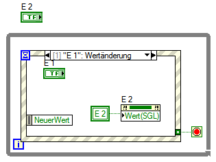 Dann platziere ich einfach im Eventcase E1 eine lokale Variable des Bedienlementes E2 und füttere damit den Ereignisknoten von E2/Wert signalisierend.