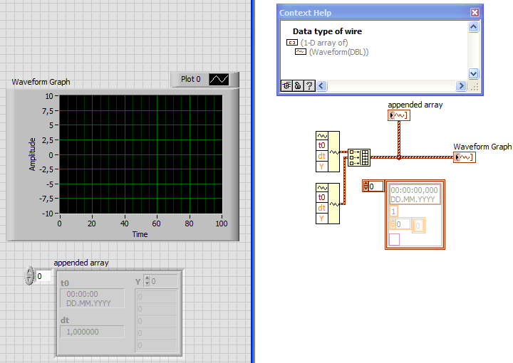 Hast du auch die Kontexthilfe geöffnet (Falls diese schon unter LV6 verfügbar war). Dort kannst du direkt den Datentyp ablesen. In deinem Fall ein 1D-Array aus Waveforms. Du hast als Bedienelement aber ein 2D-Array erstellt.