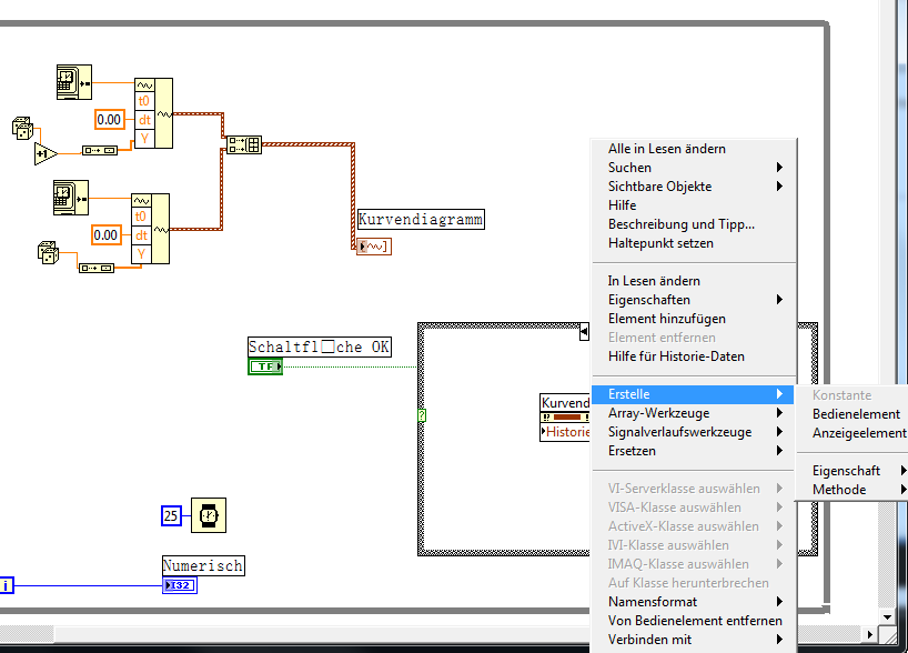 ich benutze labview 6.1 und bin relativ unerfahren - habe nun folgendes Problem: ich füge 2 meßwertgrößen mit den jeweiligen Zeitstempeln in ein Kurvendiagramm. Nun möchte ich noch einen Button, mit dem ich das Diagramm löschen kann. Habe schon herausgefunden, dass man dazu eine property node des kurvendiagramm erstellen muss und dieser node dann eine leere Konstante zufügen muss, um zu löschen. Wenn ich allerdings diese Node erstelle, auf setzen ändere und dann den Knoten anwähle mit der Absicht, eine Konstante erzeugen zu lassen, ist diese Option ausgegraut. Sämtliche versuche, diese Konstante dann selbst zu basteln scheitern. Wenn ich ein Bedienfeld automatisch generieren lasse, dann funktioniert der Button, aber ich möchte im Frontpanel eben so ein Bedienelement nicht sehen.