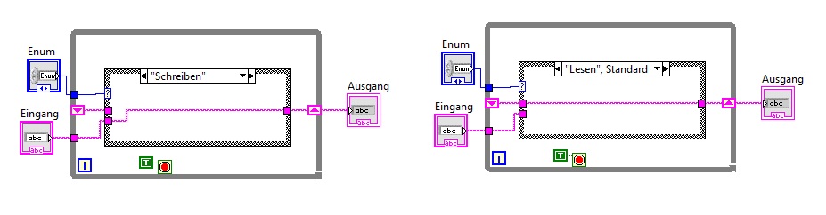 (29.04.2013 15:47 )Hasenfuss schrieb:  Mein Problem liegt darin - eine FGV ist - so wie ich es verstanden habe - keine wirkliche globale Variable, sondern ein VI mit einer while-Schleife mit einem case, der zwei Befehle kennt, z.B. "Schreiben" und "Lesen". Auf dem Frontpanel hab ich ein Enum mit den beiden Befehlen als Bedienelement. Dann hab ich ein Bedienelement und ein Anezigeelement, beide vom gleichen Typ, z.B. einen String, die ich Eingang und Ausgang nenne.