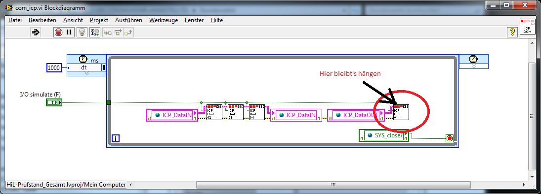 Wenn ich nach Absturz im entsprechenden SubVI die Highlight-Funktion zum Debuggen aktiviere, sehe ich, dass immer ein bestimmtes SubVI aktiv ist (grüne Pfeile auf dem SubVI-Symbol). Schaue ich nun in dieses Sub(sub)VI rein, hängt dieses im Status "Wartet auf Ausführung". Es bleibt also irgendwo zwischen Aufruf und beginn der Ausführung hängen.