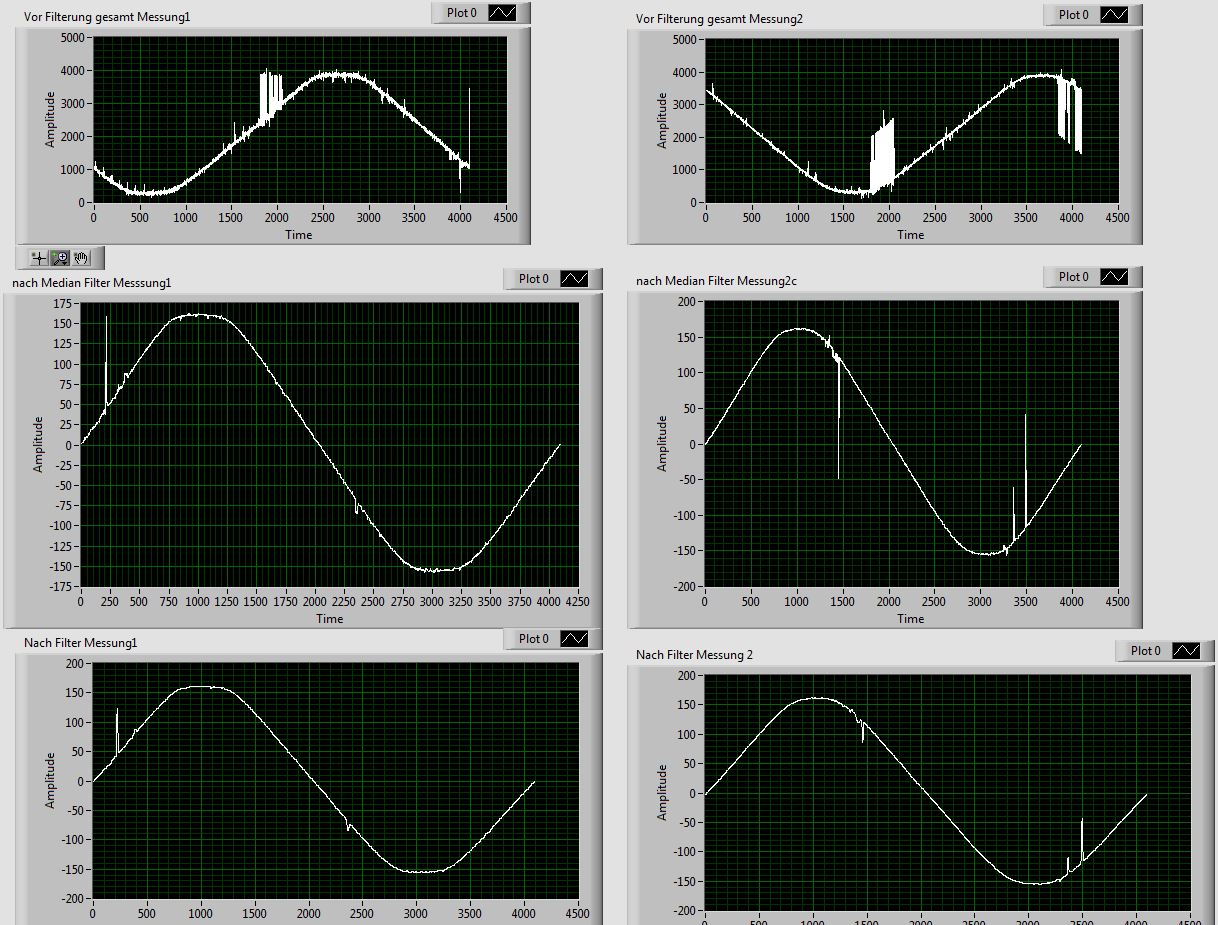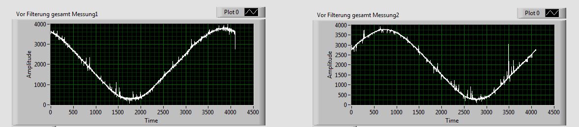 Ahja beim ersten Bild (ohne Filter) ist der Sinus so wie er gemessen wird. Der wird aber noch verschoben so das er beim 0Punkt beginnt (wie in den unteren Graphen mit Filter). Die Peaks werden Polynomial gefiltert das funktioniert perfekt.