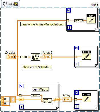 Zitat:Man sieht leider nicht, wo z.B. diese lokalen Variablen mit 1D-Arrays befüllt werden. Man sieht nicht, wie die Arrays zusammengesetzt werden. Man sieht nicht, ob du irgendwo eine Schleife mit einem uninitialisierten Schieberegister (und Arrays darin) verwendest...