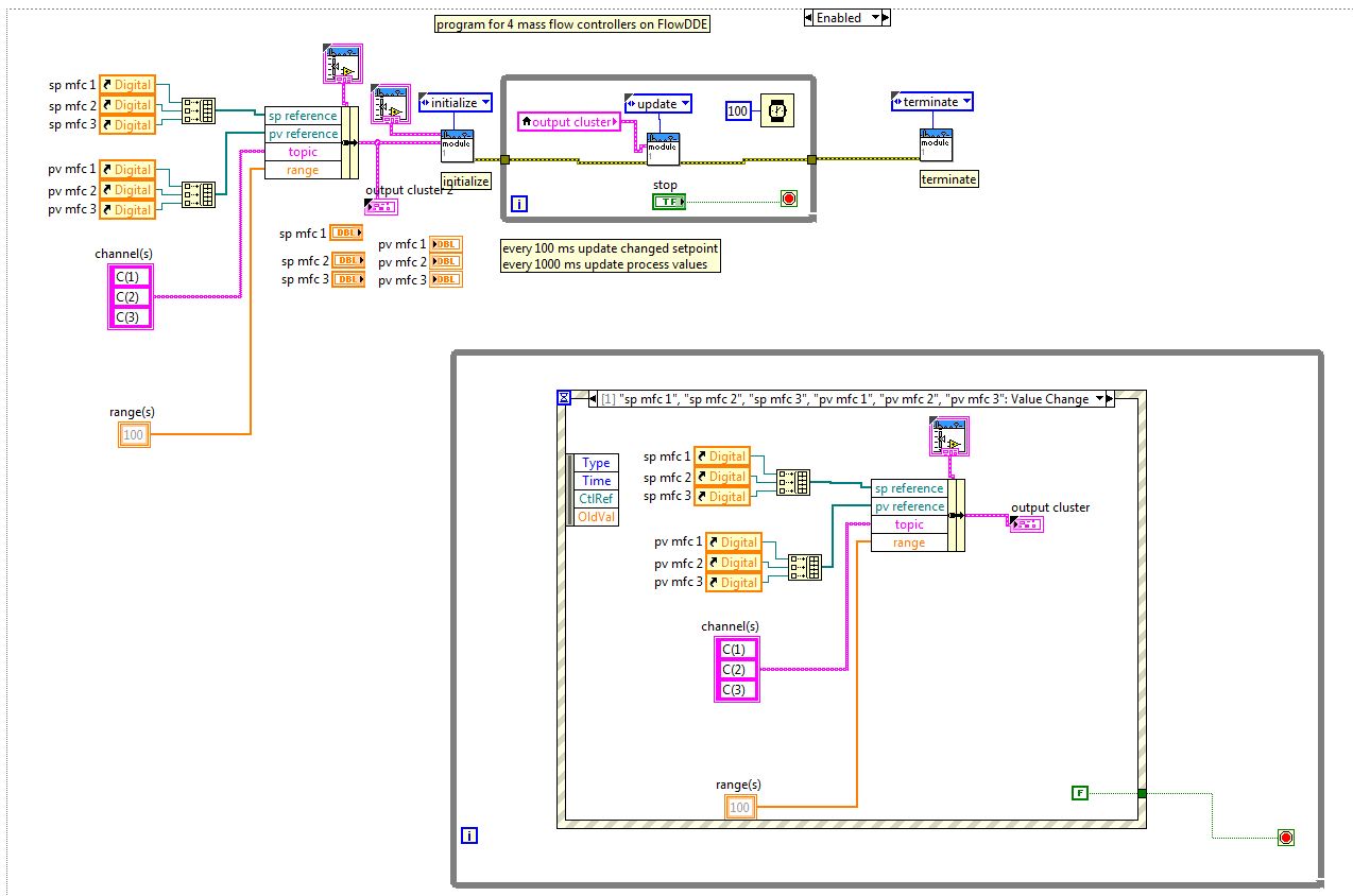Das war am amfang mein Problem. Ich wusste eben nicht ob von der Bronkhorst Homepage heruntergeladene VI für 4 MFC`s meine MFC`s steuern kann. Irgendwie sah es so aus, dass in dem kleinen while-Schleife die Werte nicht aktualisiert werden. Also das Program macht am Anfang was aber danach läuft er nur in dauerschleife ( so wie ich das irgendwie verstanden habe). Jetzt denke ich mir auch ob ich die größe While-Schleife komplett löschen soll. ( Deshalb habe ich auch " Cluster2" erstellt). Dazu ein Bild im Anhang