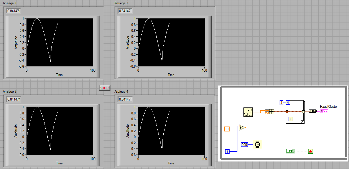 Ich wollte verschieden Anzeigen, unter anderem einen WaveformChart und einen numerischen Wert in einem Cluster zusammenfassen und gemeinsam plotten. Innerhalb der Anwendung wollte ich dann einen neuen Wert ueber einen property node uebergeben, und zwar so wie ich es bei cluster 2 gemacht habe.