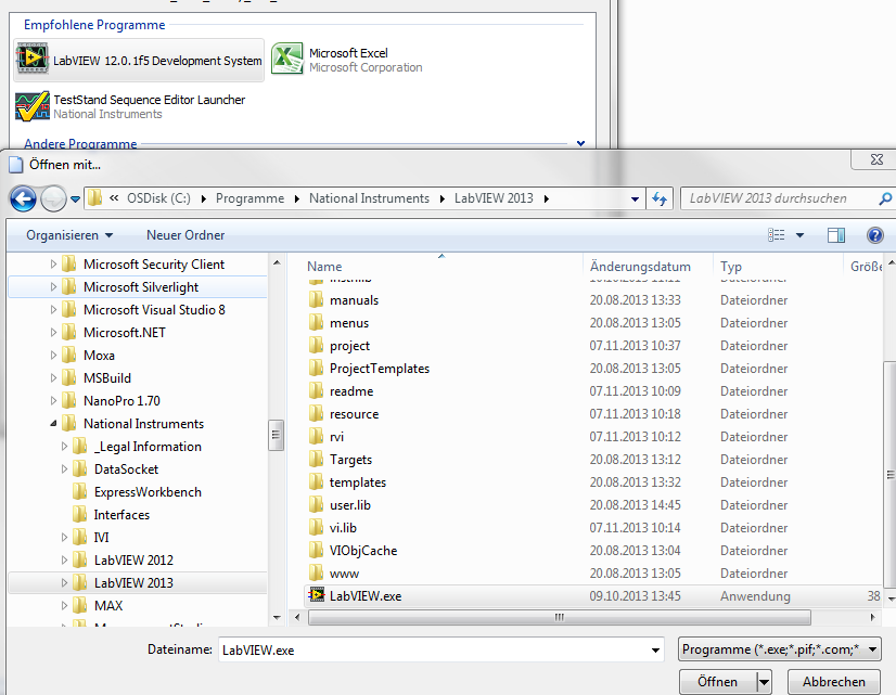 Windows merkt sich, mit welchem Programm du zuletzt einen Dateityp (hier .vi) geöffnet hast. Wenn dies LabVIEW2012 war, dann wird beim nächsten *.vi-Aufruf versucht, dieses mit LV2012 zu laden. Dummerweise beruht diese Erkennung auch noch auf dem Umstand, dass der Name (und nicht der Pfad!) des benutzten Executables (hier "labview.exe") mitentscheidet - und alle LabVIEW-Versionen haben nun mal den gleichen Namen "labview.exe"...