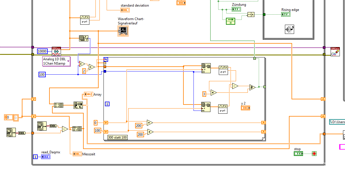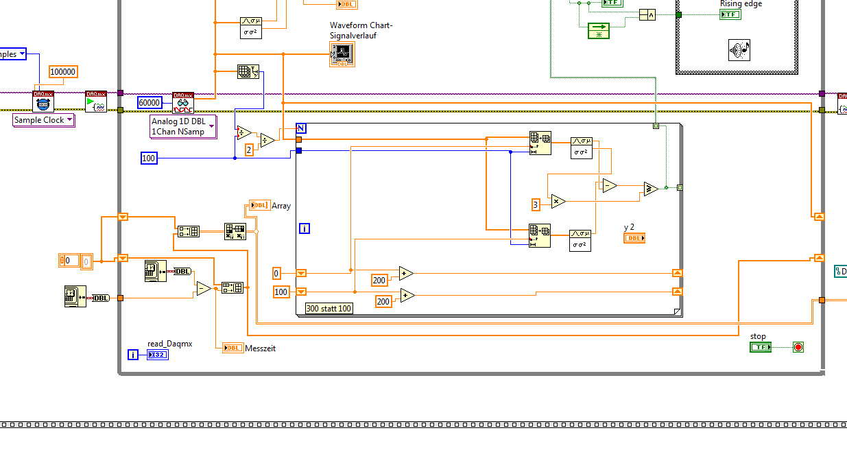 ich versuche so viele Daten zu speichern so wie lange die Messung geht. Also ich habe versucht DAQmx read aus der While Schleife raus dann so in die erste Schiebe Register aber das geht auch nicht. Ich messe die ganze Zeit aber keine vernünftige Werte bekomme ich raus. Ich checke einfach nicht mehr. orry aber was meinst du als 1X Daqmx? Ich bekomme doch alle Werte aus DAQmx