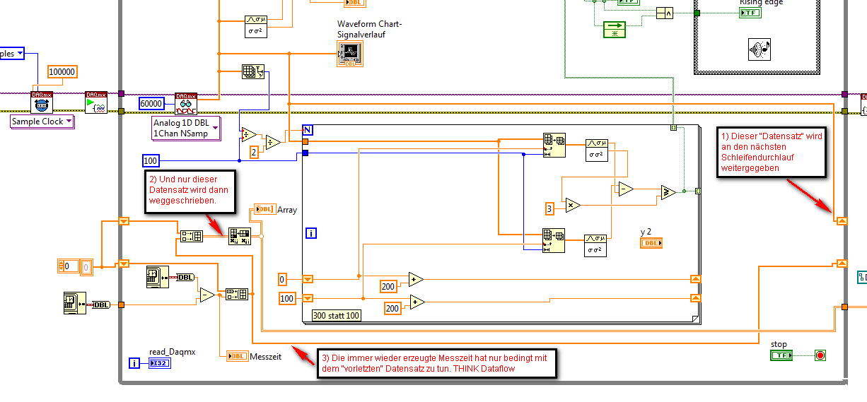 Verfolge den Datenfluss! Der Datensatz aus 1x DAQmx wird per Schieberegister an den nächsten Durchlauf der Schleife weitergegeben.
